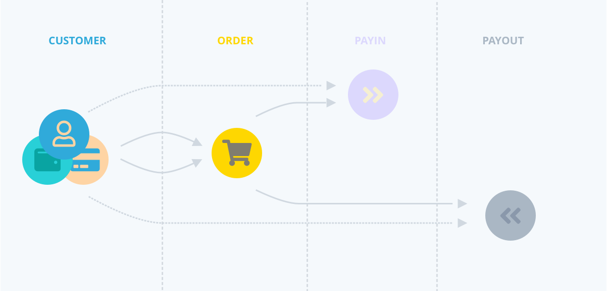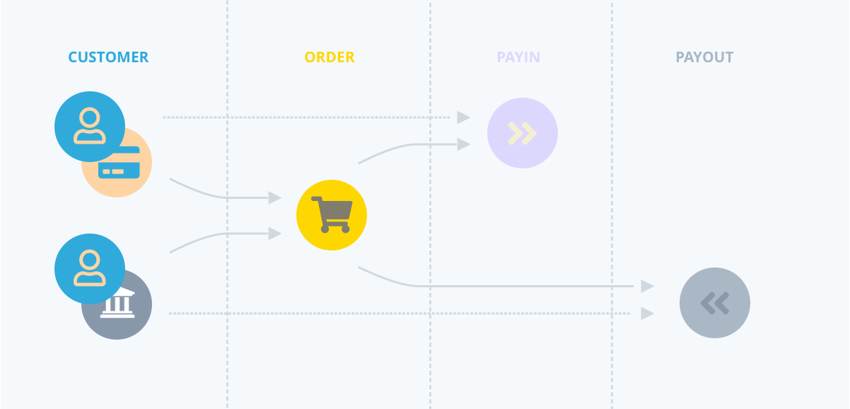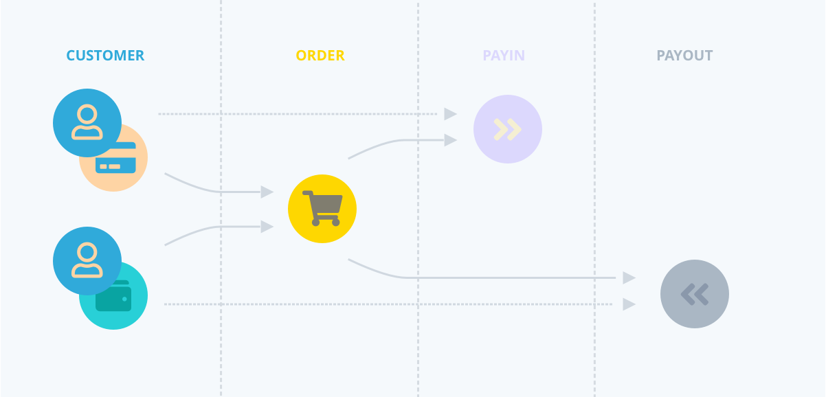 Using this default configuration, the standard relationship between customers, orders, pay ins and payouts will result in something like: