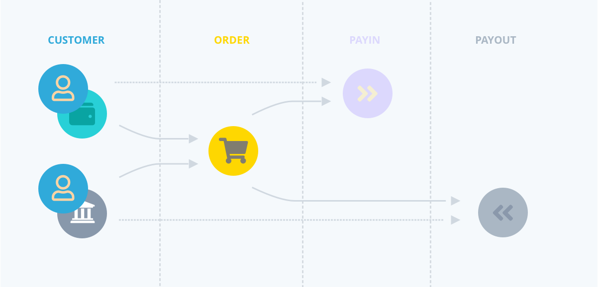 Using our standard order life-cycle and our available payin and payout types we offer a variety of money flows to cover almost every need. This kind of complex movement is only available through our API and it requires you to follow our guidelines to complete the desired output. Please, read carefully the following descriptions in orders to understand the full cycle.Payin to Wallet